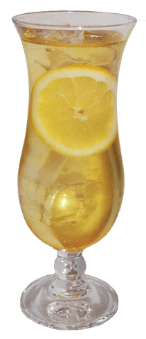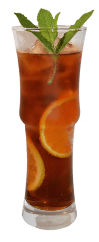 Den Eistee mit Eis in einem Tumblerglas Servieren und mit Zitronenscheibe, Orangenscheibe und Minzezweig dekorieren.